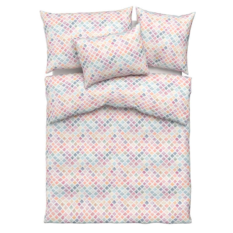 Das Muster „Bice“ erinnert an einen frischen Frühlingstag. Auf dem weichen Stoff sehen Sie viele kleine Vierecke, die auf der Spitze stehen (Rauten). Obwohl das Muster bunt ist, bringt es viel Ruhe in den Raum. Das liegt an den hellen, sanften Farben: Ein zartes Rosa mischt sich mit hellem Orange, hellem Lila, Hellblau und einem feinen Grün.