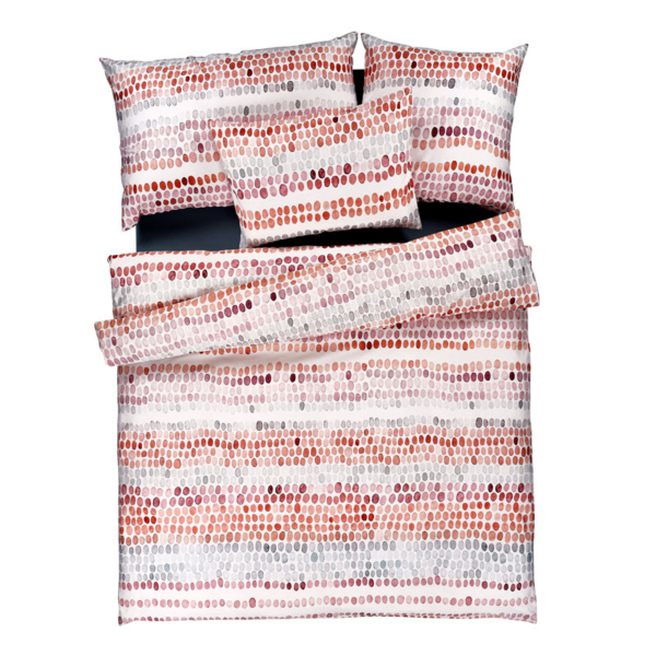 Diese Bettwäsche-Garnitur überzeugt mit einem modernen und verspielten Design aus ovalen Farbklecksen. Sanfte Pastelltöne wie Hellblau und Rosa ergänzen warme Braun- und Beerentöne. Die ovale Form der Farben ist in horizontalen Streifen angeordnet und erinnert an handgemalte Aquarellpunkte. Der weisse Hintergrund unterstreicht die harmonische Farbgestaltung und sorgt für eine freundliche, zeitlose Atmosphäre im Schlafzimmer.