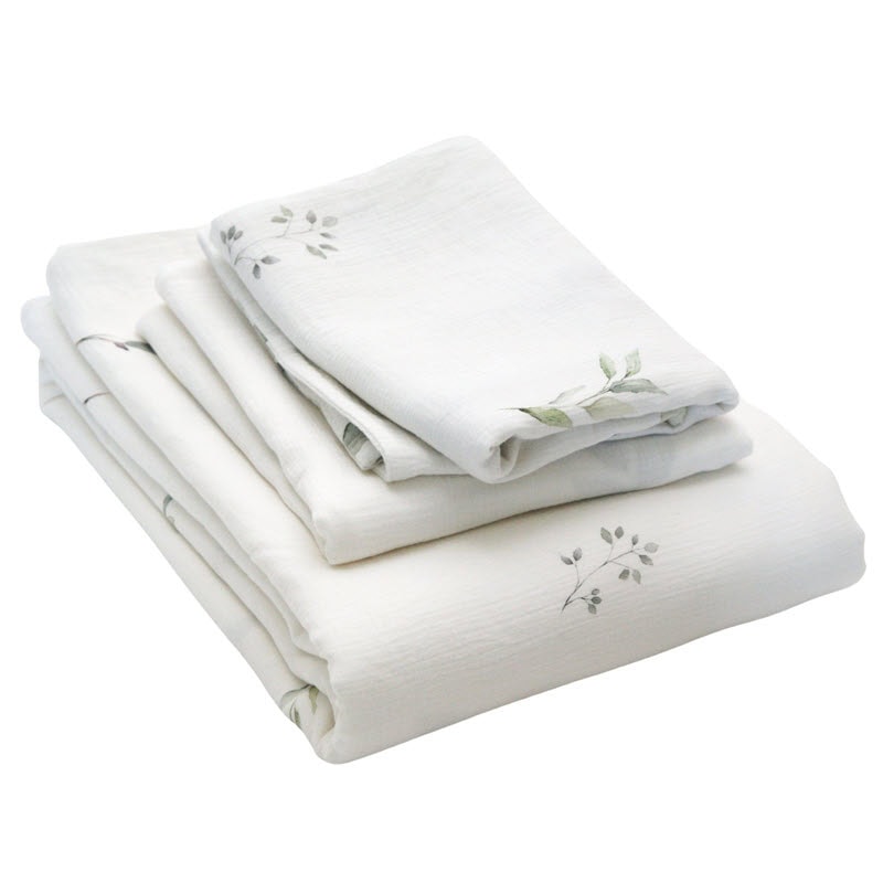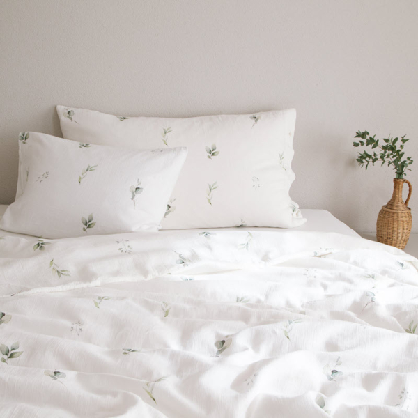 Startseite » Shop » Bettwäsche » Bettwäsche 160x210 » Musselin Bettwäsche, weiss mit Blättermuster, washed