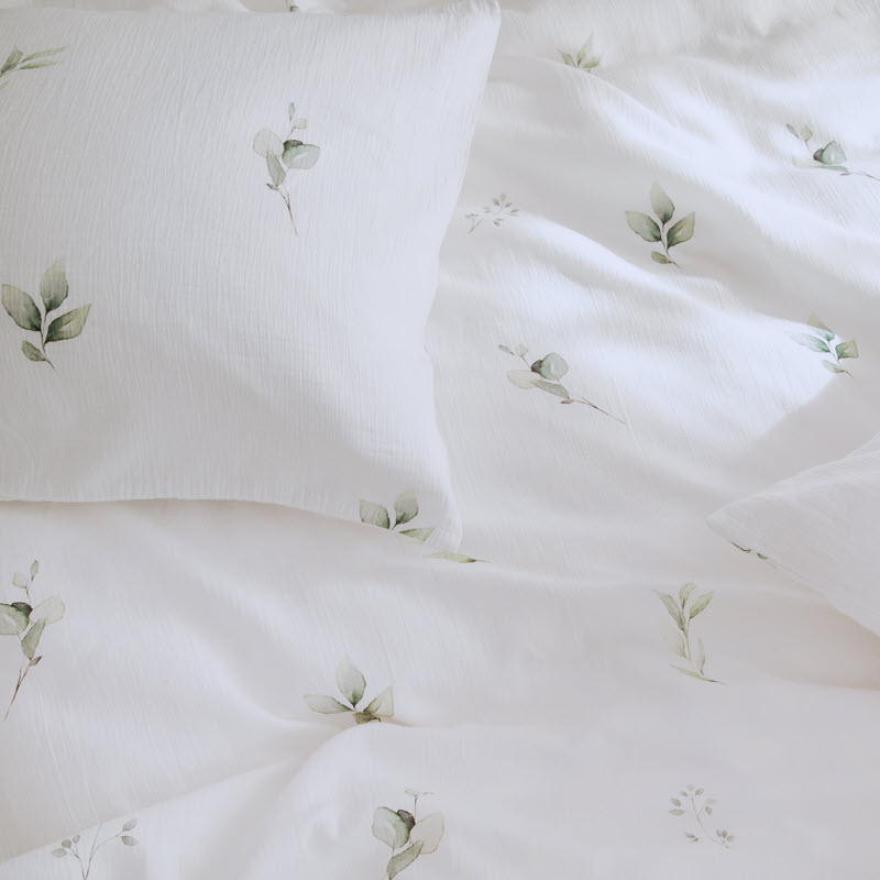 Die Musselin-Bettwäsche „Alva“ ist besonders weich und luftig. Das Design mit grünen Blättern wirkt sehr natürlich. Sie müssen diese Bettwäsche nicht bügeln, da sie eine schöne wellige Struktur hat.
